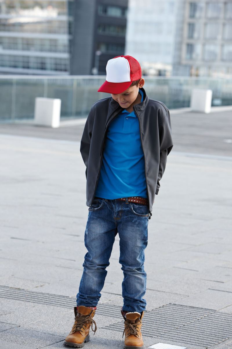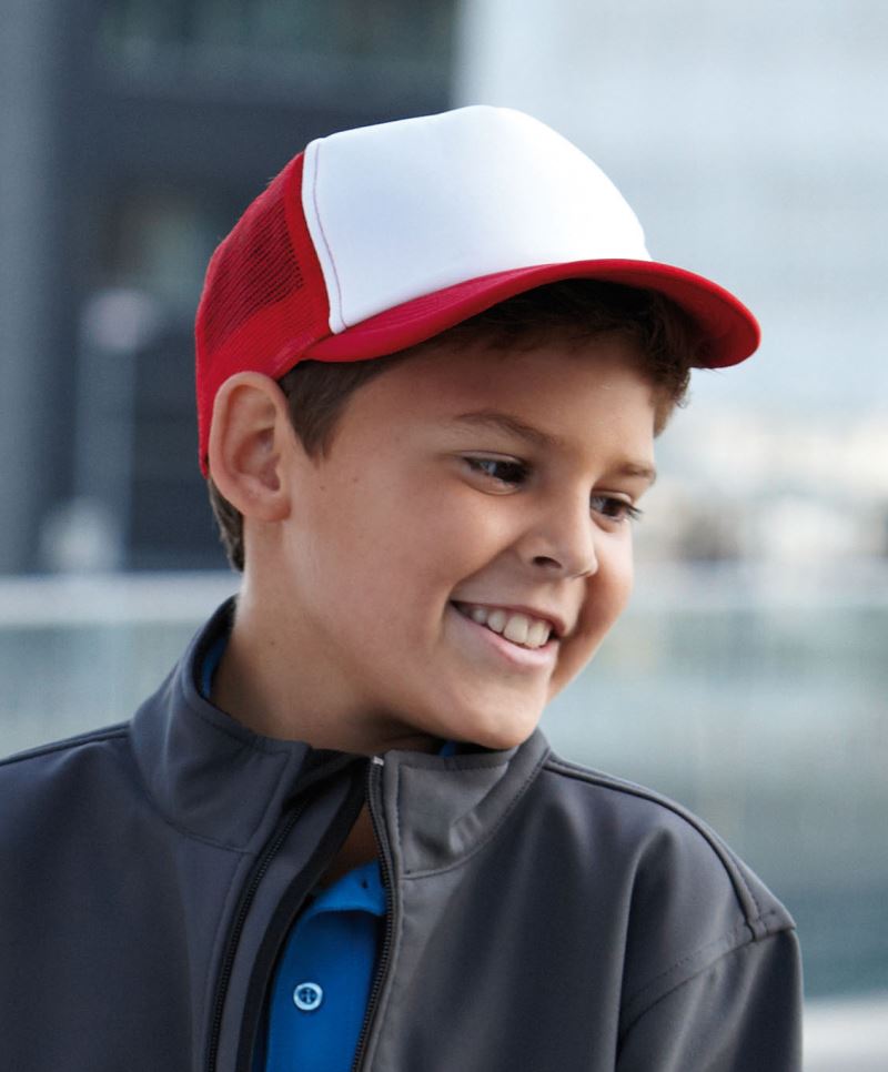 5-panelová sieťovaná šiltovka pre deti, 6 ozdobných švov na šilte, potný pás, zapínanie na patentný gombík, rôzne farebné variácie, veľkosť: 54 cm, prať na 40°, ručné pranie, nežehliť, nevhodné na sušenie v sušičke
